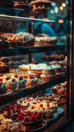A variety of baked pastries displayed in a glass showcase in a bakery. The arrangement includes different tarts, cupcakes, and pies with toppings like berries and chocolate. Warm and inviting ambiance with soft lighting highlighting the intricate details of the desserts.