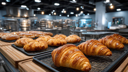 A vibrant bakery scene featuring freshly baked croissants and pastries displayed on wooden racks. Perfect for food lovers and culinary arts!