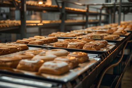 A conveyor belt carrying trays of freshly baked goods to be packaged and shipped out AI generated