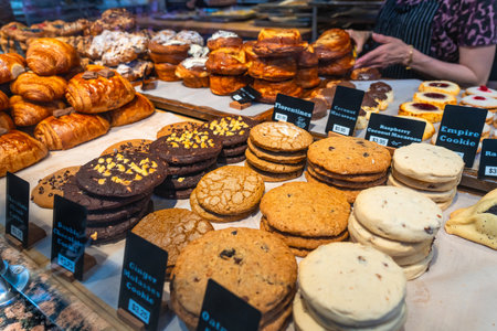 Freshly baked cookies and pastries are neatly arranged and labeled with prices in a bakery display case in Vancouver, British Columbia, tempting customers with their delicious aroma and appearance
