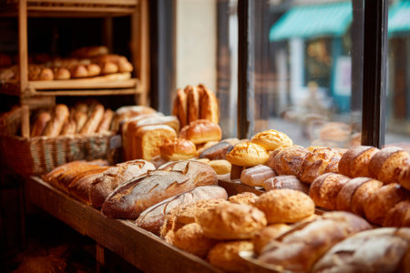 Close-up of a bakery's glass window display from outside, featuring freshly baked bread, rolls, and cookies, with each item arranged to catch the eye of passersby