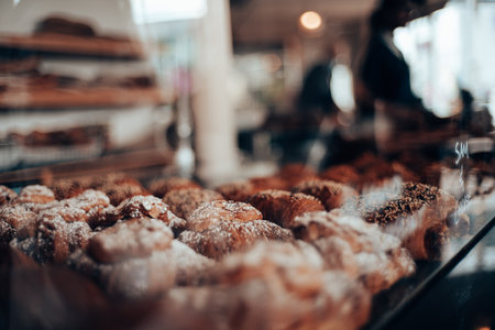 Fresh pastries with powdered sugar resting on display in a cozy bakery setting