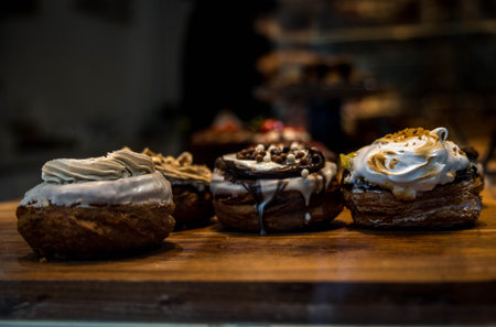 A selective focus closeup of delicious freshly-baked pastries in a cafe