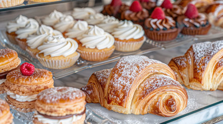 An exquisite collection of freshly baked desserts, including frosted cupcakes and dusted pastries, elegantly presented behind glass