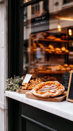 A quaint London street brimming with life features an inviting Italian bakery. The window display showcases a delectable pizza topped with anchovies, enticing passersby and inviting them inside.