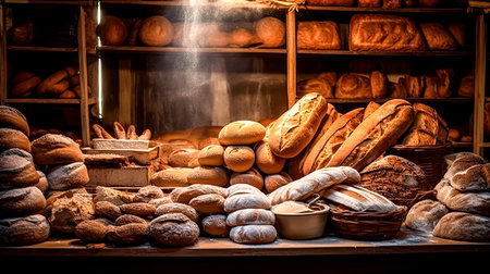 A cozy artisan bakery with a wide variety of fresh bread and pastries arranged on wooden shelves and counters. The warm atmosphere is enhanced by natural lighting and rustic decor.