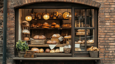 A vintage brick bakery with fresh bread displayed in the window, capturing the essence of artisanal baking.