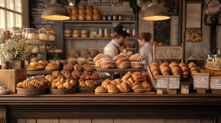 A bakery counter with fresh croissants, muffins, and breads on display, with a baker serving customers in a charming, rustic environment