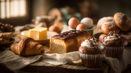 Delicious Assortment of Baked Goods and Ingredients on Rustic Wooden Table