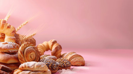 Delicious bakery display with various pastries and breads, set against a pastel background with space for text or branding