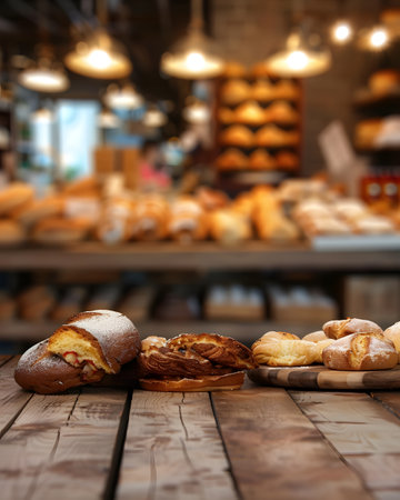 an artisanal bread display arranged on a wooden counter, showcasing a variety of freshly baked loaves, rolls, and pastries, evoking the warm aroma and wholesome appeal of homemade bakery delights