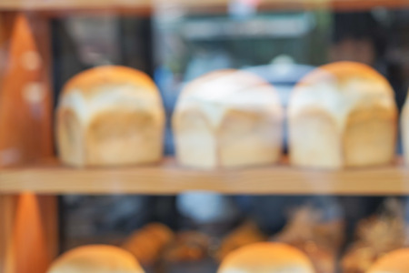 Bakery display case with variety of breads and pastries. Blurred view through store window