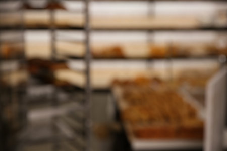 Blurred view of rack with pastries in workshop