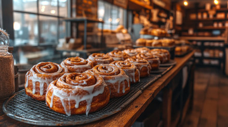 Freshly baked cinnamon rolls displayed in a cozy cafe with warm lighting inviting customers to indulge. Generative AI