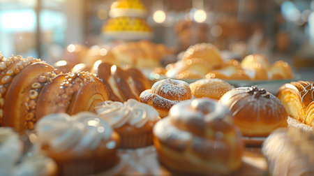 Delicious assortment of freshly baked pastries displayed in a bakery, featuring a variety of shapes, sizes, and toppings, capturing the essence of a traditional bakery.