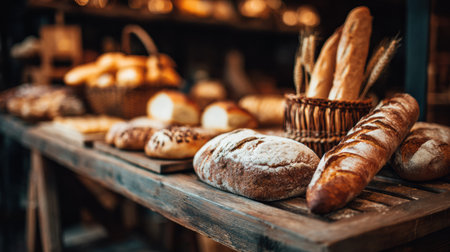 a quaint bakery, where artisanal bread varieties are artfully arranged on a rustic wooden counter, tempting passersby with their delicious aroma