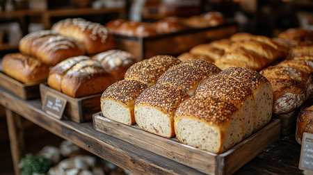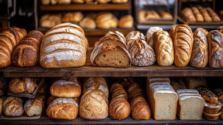 bakery display, bread loaves on wooden shelves in a cozy, traditional automated bakery, creating a rustic, wholesome vibe with fresh baked goods