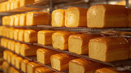 A Freshly baked bread on production line, showcasing quality and efficiency in packaging and distribution