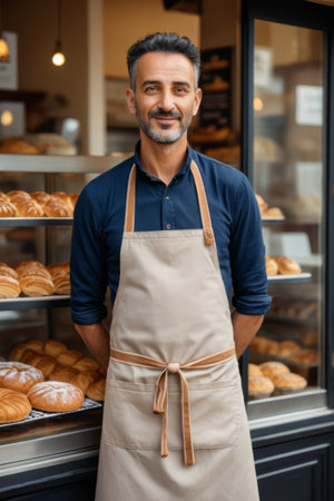 business owner with bakery shop background