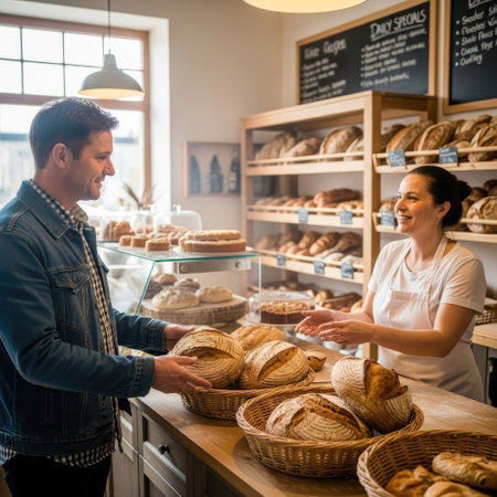 A customer interacts with a shop assistant, both focused on a display of bread. Baskets of various loaves sit on the counter. The scene presents soft lighting and a warm color palette. This image is suitable for commercial use, highlighting the atmosphere of a bakery setting.