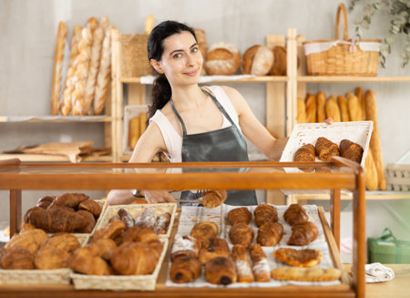 Young woman employee puts croissants in window, arranges display of goods at bakery.
