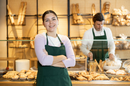 Young smiling female clerk standing by counter against display with bakery assortment