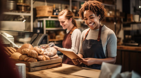 Baker store woman smiling. Happy person selling bakery product. Generate Ai