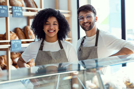 Portrait of two younger owners selling fresh pastry and loaves a bread section and smiling at pastry shop.