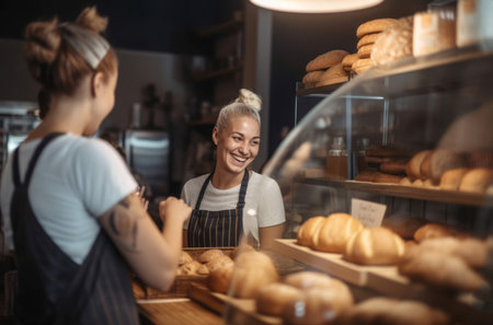 Bread seller with young woman customer in the beautiful store with bakery products