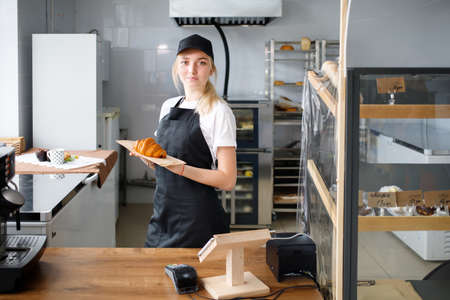 Young beautiful girl saleswoman in a cafe with pastries and a bakery