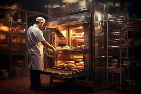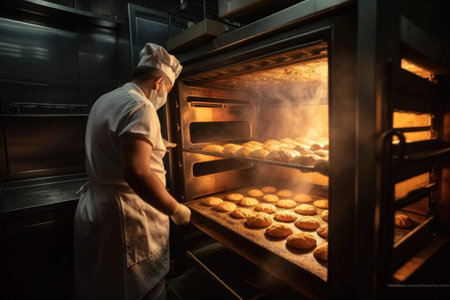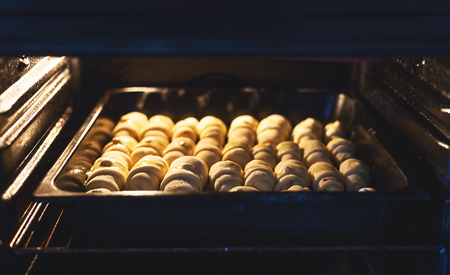 cooking buns in the oven with an open door in the kitchen of a restaurant by a chef