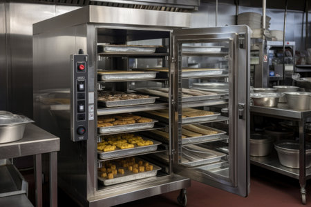 temperature-controlled cabinet with shelves stacked high with food, ready for serving, created with generative ai