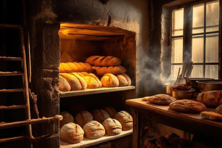 Bakery in the morning, hot fresh bread and pastry baking in the old town bakery, freshly baked products on shelves and the oven, small local business and food production. Generative Ai.
