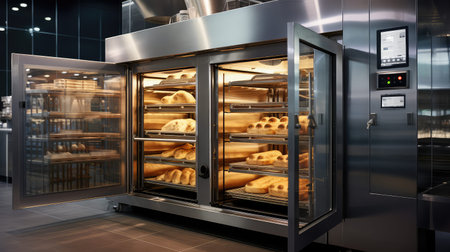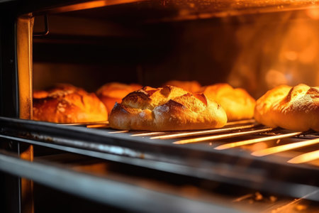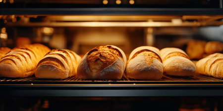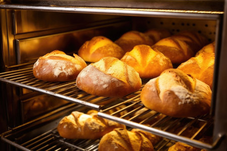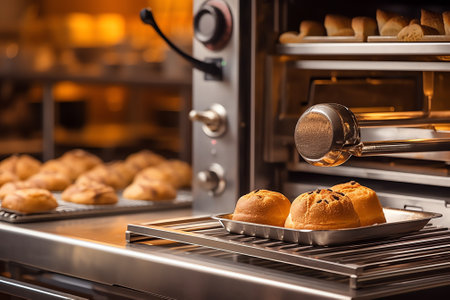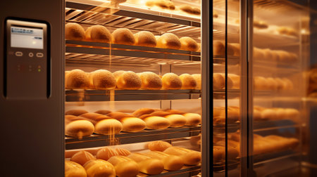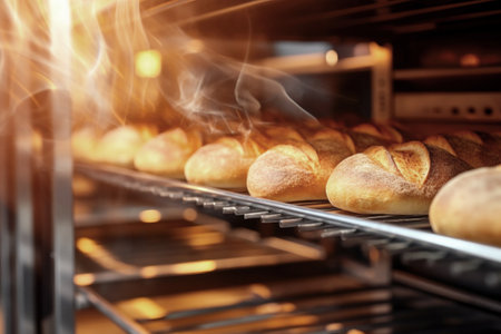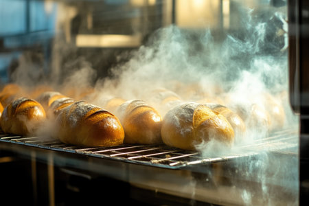 Golden bread rolls cooling in an industrial oven create an inviting atmosphere in a modern bakery, showcasing the art of fresh baking with steam rising and warm hues.