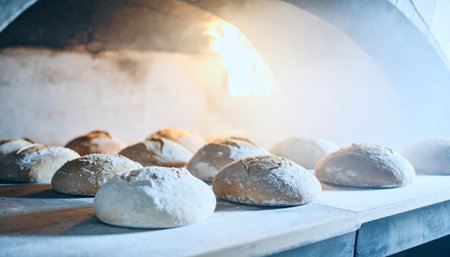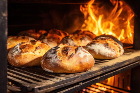 Closeup of artisan sourdough loaves in brick oven at equinox feast preparation, flour dusted wooden peel, glowing embers, shallow, warm harvest tradition atmosphere.