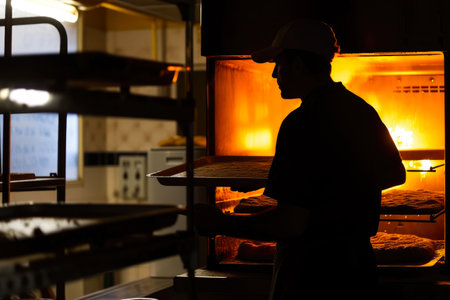 A worker at a bakery takes fresh bread out of the oven. Industrial production