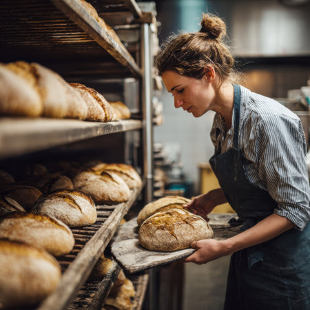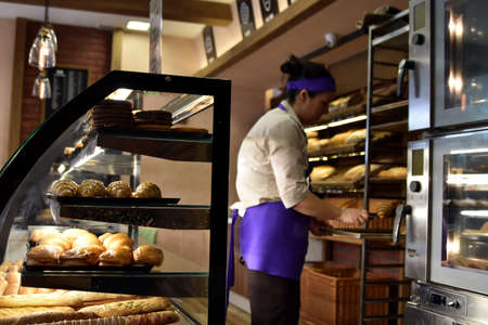 female baker puts freshly baked fresh bread on the shelf in kitchen of the bakery