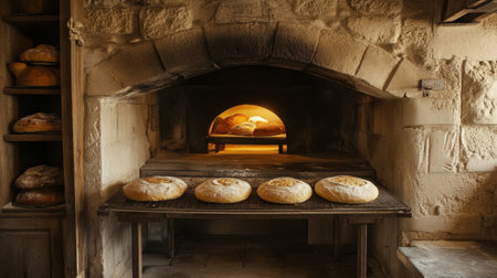 A cozy rustic bakery scene featuring freshly baked artisan bread, showcasing a traditional stone oven with warm hues and inviting textures.