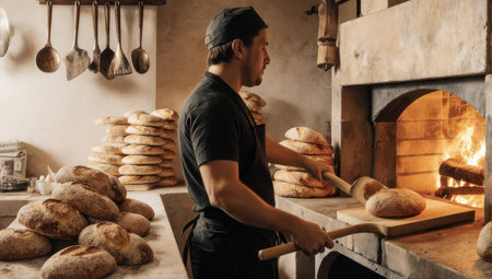 A skilled baker in a black uniform carefully uses a long wooden peel to place loaves of freshly prepared bread into a glowing, hot wood-fired oven, surrounded by stacks of baked goods.