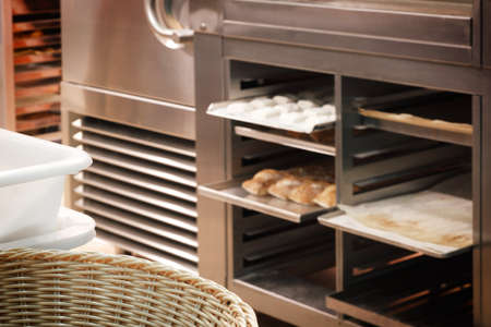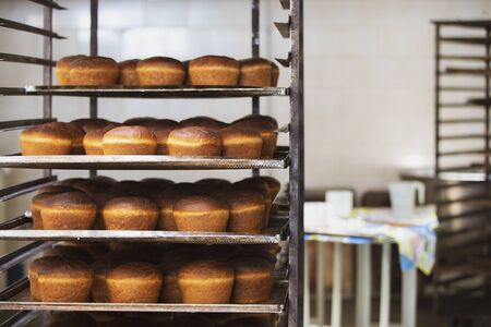 Dessert bread baking in oven. Production oven at the bakery. Baking bread. Manufacture of bread.