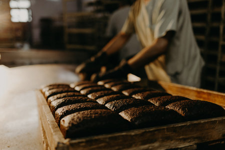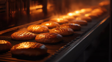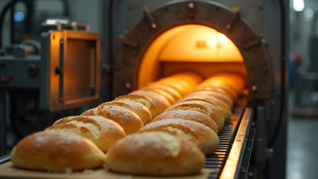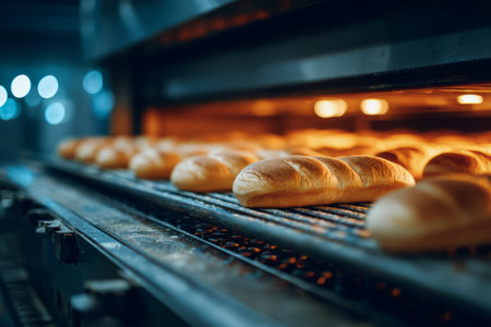 In a bustling bakery, freshly baked loaves travel along a sleek industrial conveyor. Each bread demonstrates the craftsmanship involved in modern baking, reflecting warmth and quality.