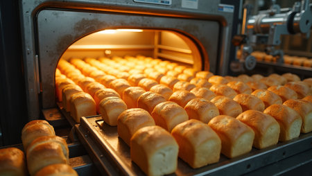 Golden baked bread loaves on conveyor belt in industrial bakery