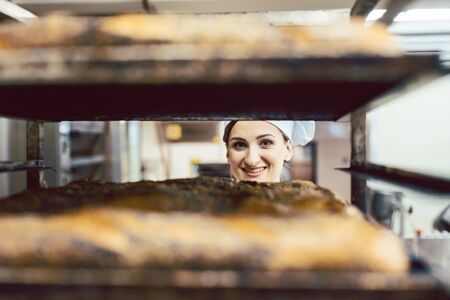Beautiful baker woman looking though bread on sheets, focus on her face