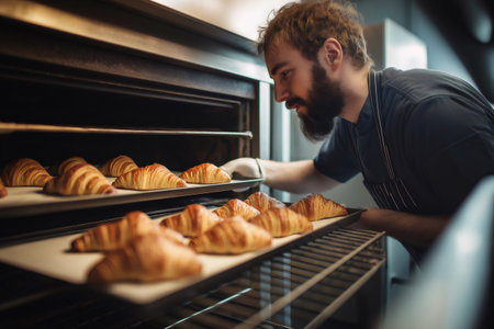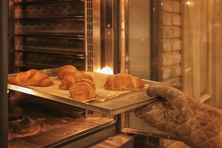 Professional baker pulling a tray of golden brown croissants from a commercial oven in a bakery