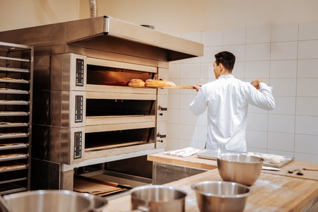 Taking the loafs. Young dark-haired baker wearing white uniform taking the loafs of bread out of the oven