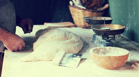 Production of bakery products in a bakery. The baker kneads the dough for baking buns.