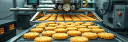 Baking process of golden cookies on a conveyor belt in a bustling factory during the morning shift