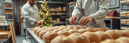 Bakers preparing festive treats in a cozy bakery during the holiday season
