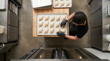 automated baking process, advanced bakery using robotic arm to transfer freshly baked pastries onto conveyor belt, streamlining the baking process
