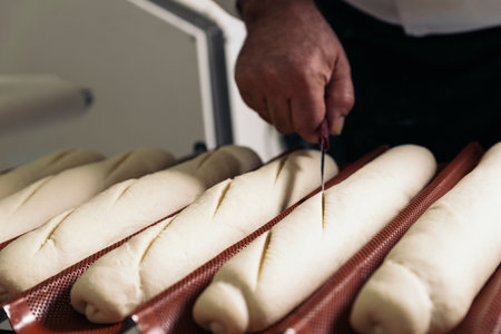 Male baker cutting open some loaves of bread before putting them inside the oven in a bakery